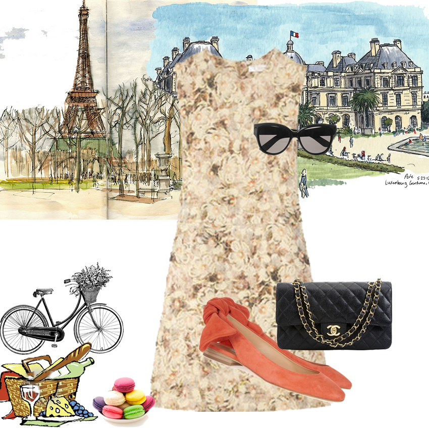 Pretty Chloé dress, Carven sling back flats, in that sweet coral crush, YSL sunglasses; say it with me; Yves (Eve) Saint (San; note the quiet “n” and subtle “a”) Laurent (Lo-wRo(ng)- subtle “w” and from the throat people let your R’s role) because we will soon be deprived the pleasure of saying it and poking fun of people who can’t! lol thanks Hedi… but back to brunch, the almighty and most iconic Chanel 2.55 completes this look. Nothing, and I mean nothing, defines Paris like Chanel or the Parisienne like the 2.55; its the most emblematic symbol of the die hard fashion faithfuls, hence it is most appropriate for brunch. Enjoy the delights of the city on your bike with a picnic brunch to go, cop a squat in the Jardin and lose yourself for a few hours in the day, have some wine, cheese and the usual suspects of French cuisine and by all means allow yourself to stop and smell the chichi French air…you deserve to.