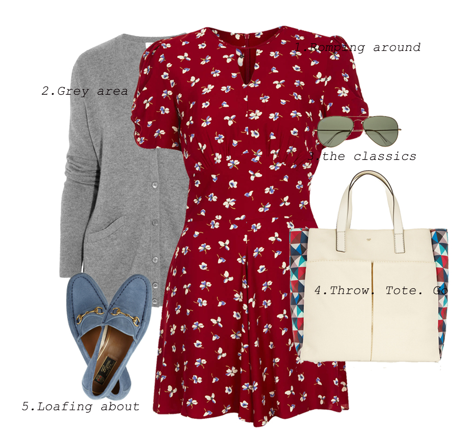 1. Romper; Topshop. 2. Cardigan; Equipment. 3. Sunglasses; Ray-Ban. 4. Leather trim tote; Anya Hindmarch. 5. Suede loafers; Gucci.